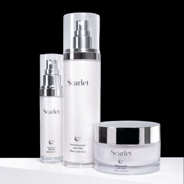 HERMOSA Scarlet Set is a high-performance night skincare line formulated with PQQ, a functional ingredient known to possess antioxidant activity approximately 5,000 times greater than Vitamin C. It is designed as a foundational skincare solution for